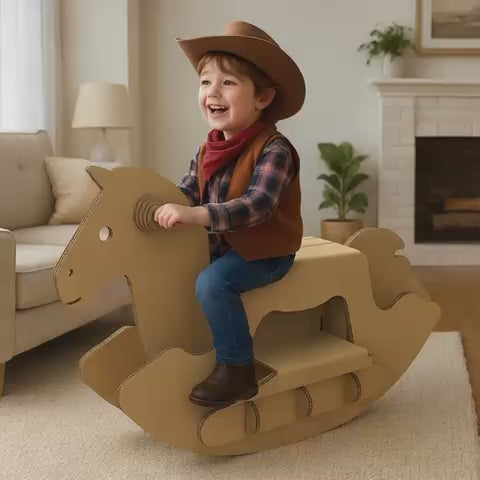 Este caballito mecedora de cartón reciclable, con diseño suave y amigable, es perfecto para que los niños jueguen. Se arma fácilmente sin herramientas ni pegamento, garantizando seguridad y diversión.