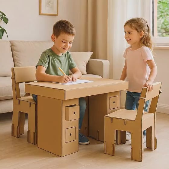 Escritorio de cartón para niños de 3 a 7 años, perfecto para jugar, aprender y crear sin pantallas. Incluye dos sillas y cajones para guardar todo lo necesario y fomentar la imaginación.